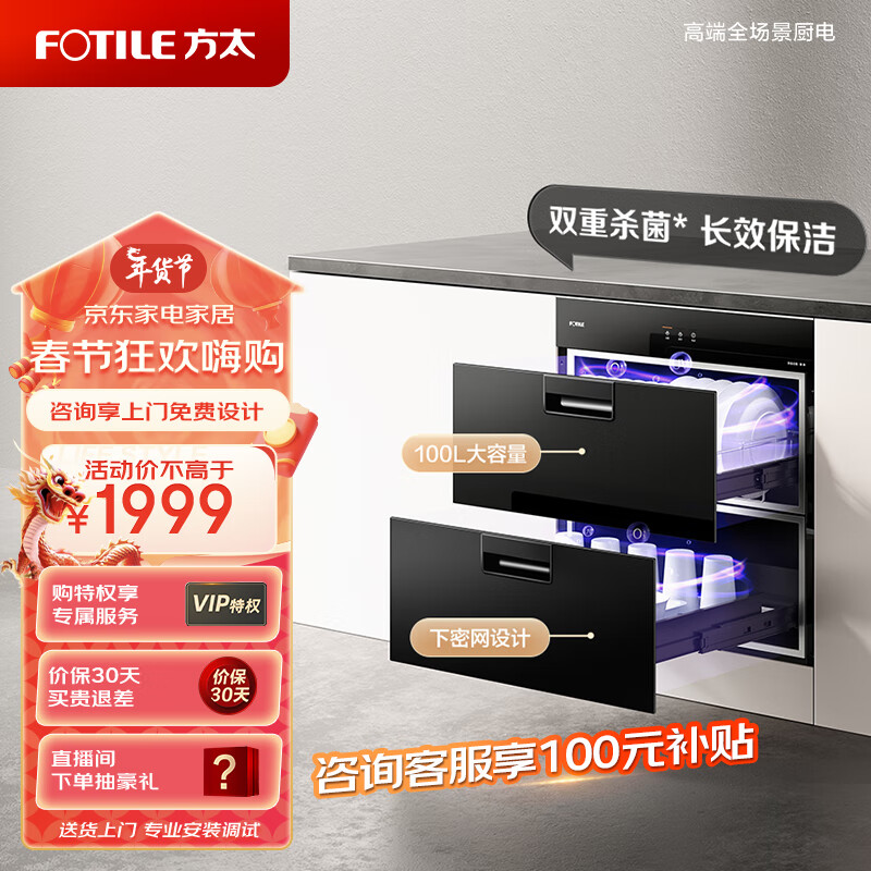 方太消毒柜家用 嵌入式 消毒筷碗柜 100L双层大容量下密网设计二紫外线消毒杀菌 ZTD100J-J51E价格:1999.00元!