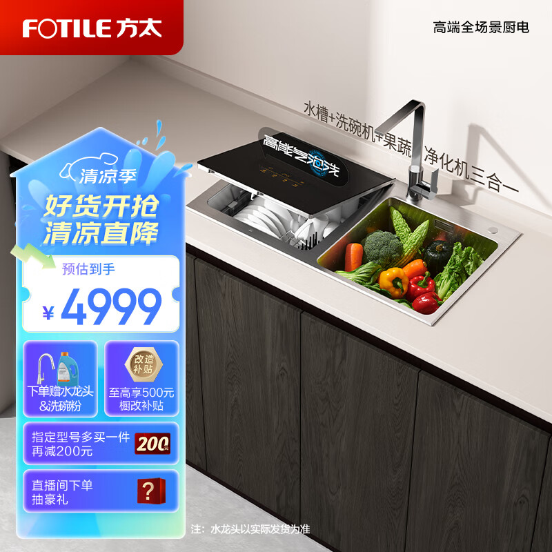 方太(FOTILE)洗碗机水槽式家用 跨界三合一 全自动洗烘一体 高能气泡洗 加强除菌 洗海鲜果蔬去农残 C3AL价格:4999.00元!