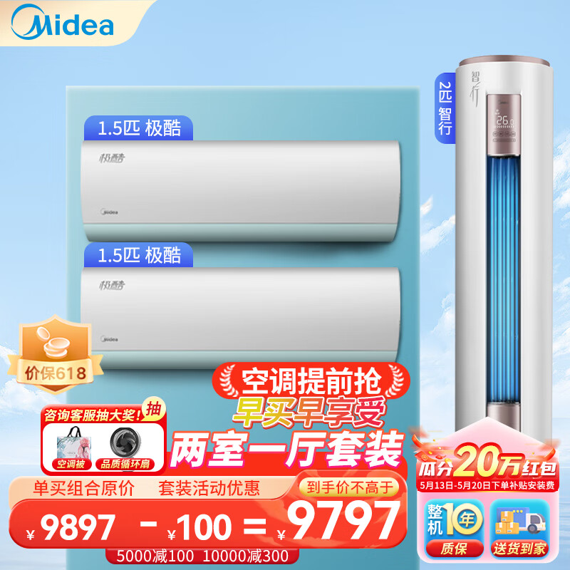 美的(Midea)空调套装两室一厅套餐 2匹智行+冷静星/酷省电/风酷/极酷 新一级能效变频挂机柜机价格:9782.00元!