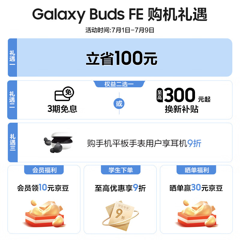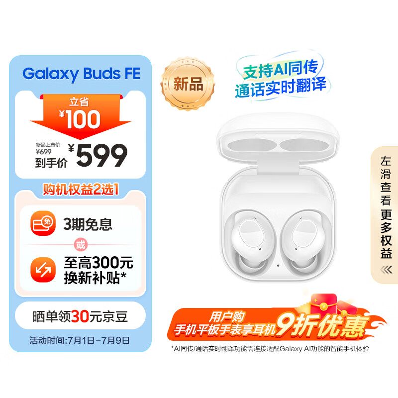 三星Galaxy Buds FE 真无线蓝牙耳机智能降噪运动耳机/AKG调校/出众音质/持久续航/舒适佩戴 雪境白价格:599.00元!
