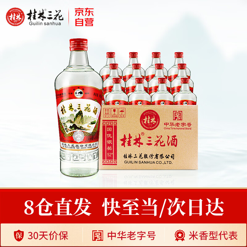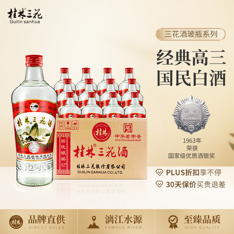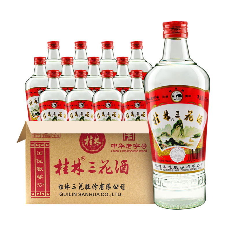 桂林三花酒 高度白酒 米香型 玻瓶 52度 480ml*12瓶 整箱装价格:255.00元!