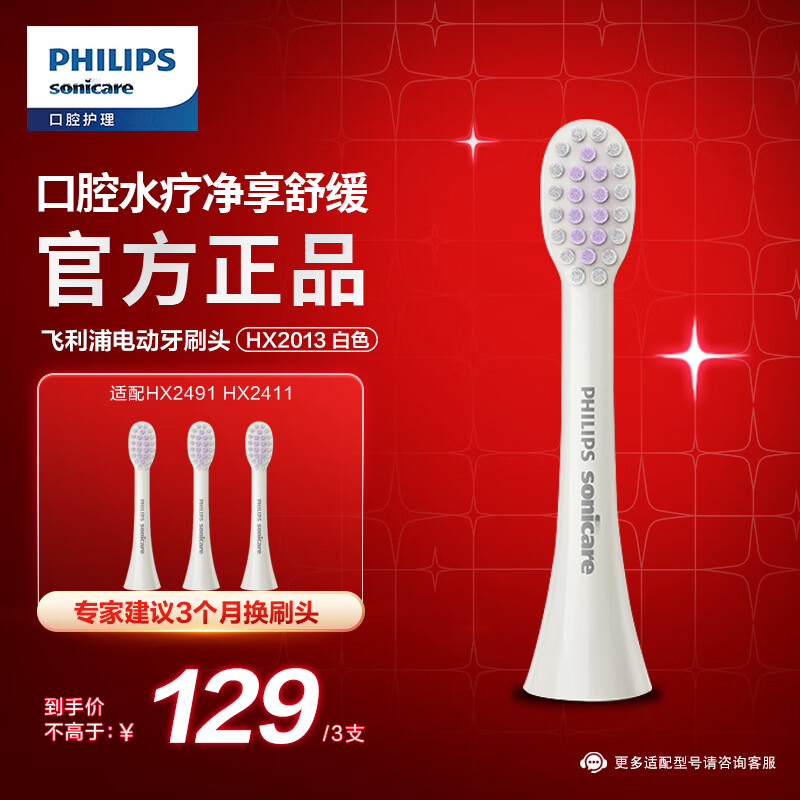 飞利浦(PHILIPS)电动牙刷头 全新柔韧小刷头 杜邦刷毛 3支装HX2013/02白色 适配HX2491水疗刷系列价格:129.00元!