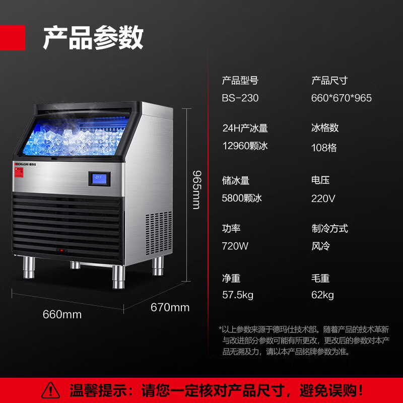 德玛仕(DEMASHI)制冰机商用大型大容量酒吧奶茶店火锅店方块冰全自动制冰器 BS-230 108冰格|日产12960颗冰价格:4599.00元!