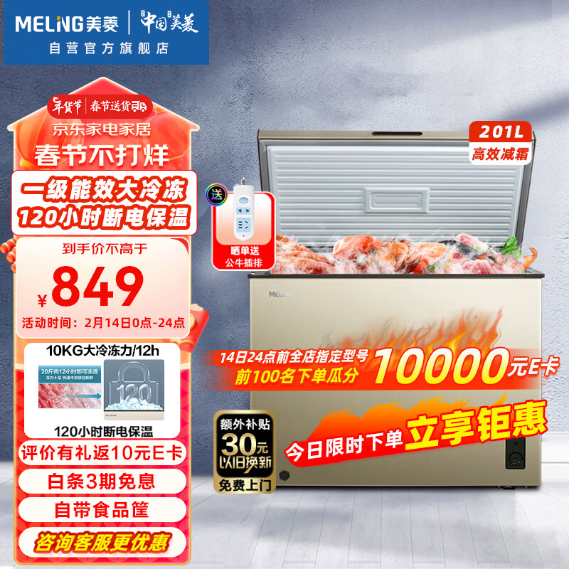 美菱(MeiLing)201升减霜家用单温冰柜冷藏冷冻转换小冷柜小冰箱一级节能省电顶开门BC/BD-201DT金色以旧换新价格:849.00元!