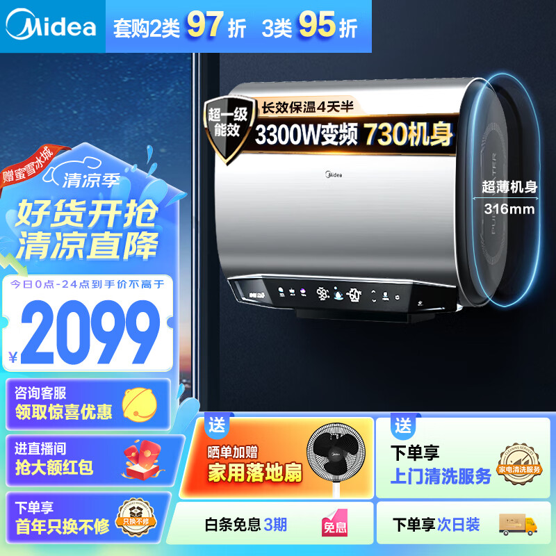 美的(Midea)50升玲珑超薄双胆扁桶电热水器3300W变频 双镁棒终生免更换12倍增容F5033-UD(HE)一级能效以旧换新价格:2299.00元!