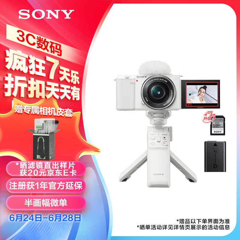 索尼(SONY)ZV-E10L APS-C半画幅微单相机 E64A存储卡电池蓝牙手柄套装 美肤拍照 精准对焦 VLOG 白色价格:5899.00元!
