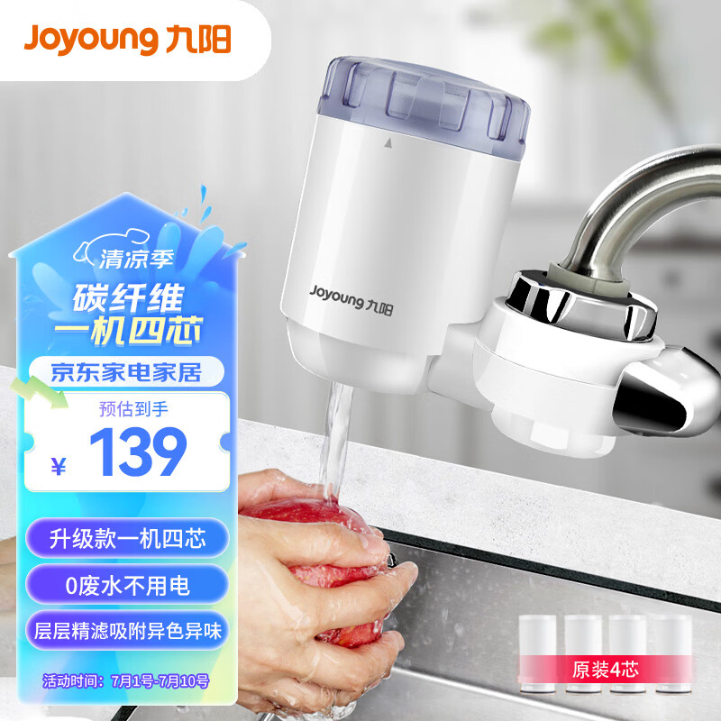 九阳 (Joyoung) 净水器水龙头台式前置净水机家用厨房过滤器碳纤维净水器一机四芯套装JYW-T12价格:139.00元!