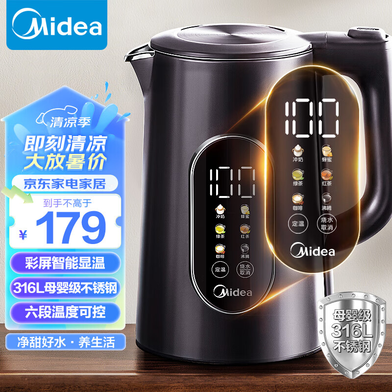 美的电热水壶烧水壶1.7L大容量双钢彩屏恒温保温家用食品级316L不锈钢电热水壶触控恒温开水壶SHE1750价格:179.00元!