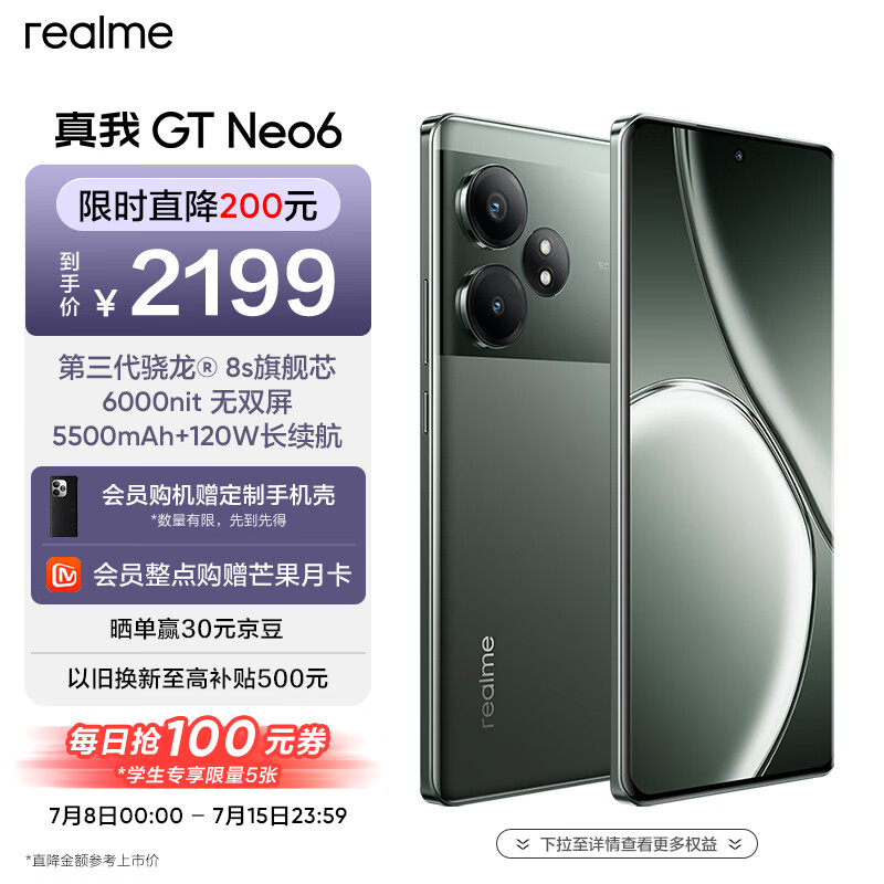 realme真我GT Neo6 第三代骁龙8s旗舰芯 6000nit无双屏 120W光速秒充 电竞5G游戏AI手机 16+256苍野骇客价格:2199.00元!