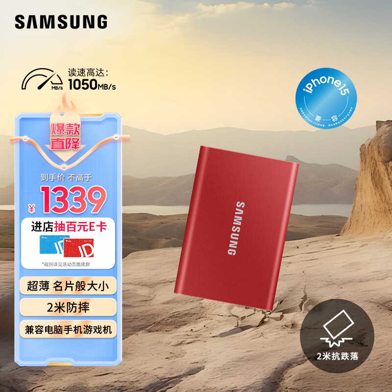 三星(SAMSUNG) 2TB Type-c USB 3.2 移动固态硬盘(PSSD) T7 红色 NVMe传输速度1050MB/s 超薄时尚价格:1339.00元!