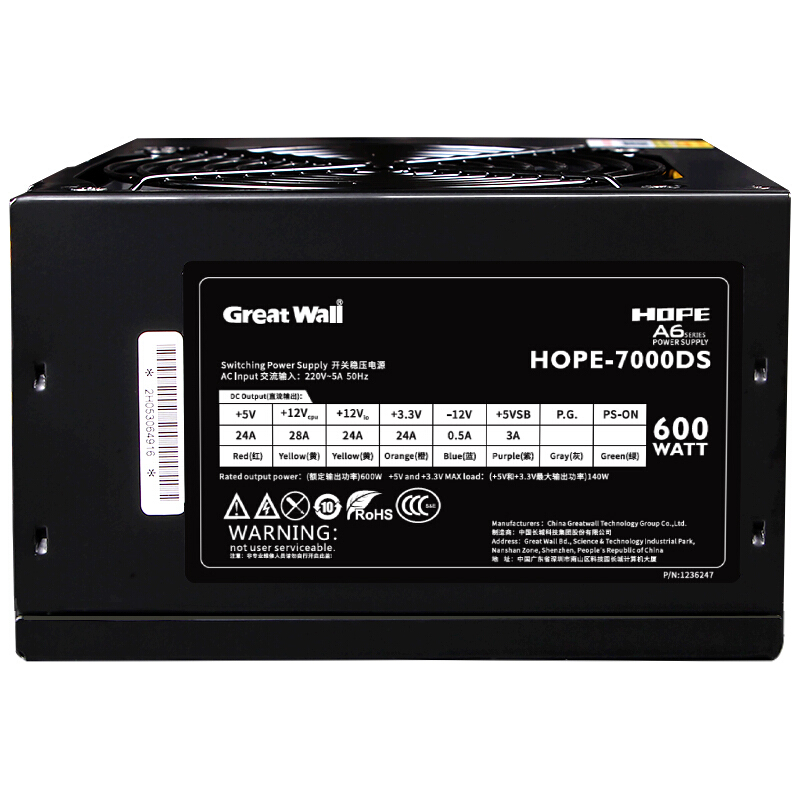 长城(Great Wall)额定600W HOPE-7000DS电脑电源(双8PIN/75cm长线材/宽幅/温控风扇/独立开关)价格:249.00元!