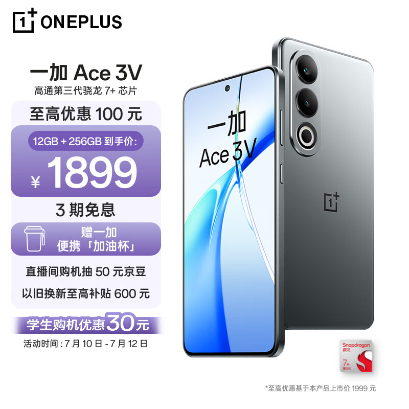 一加 Ace 3V 12GB+256GB 钛空灰 高通第三代骁龙 7+ 芯片 超长续航 OPPO AI 5G直屏游戏拍照智能手机价格:1999.00元!