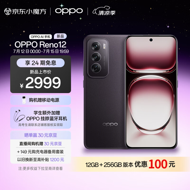 OPPO Reno12 超美小直屏 安卓Live图 天玑旗舰芯 12GB+512GB 乌木黑 游戏智能 新款 AI影像5G拍照手机价格:2999.00元!