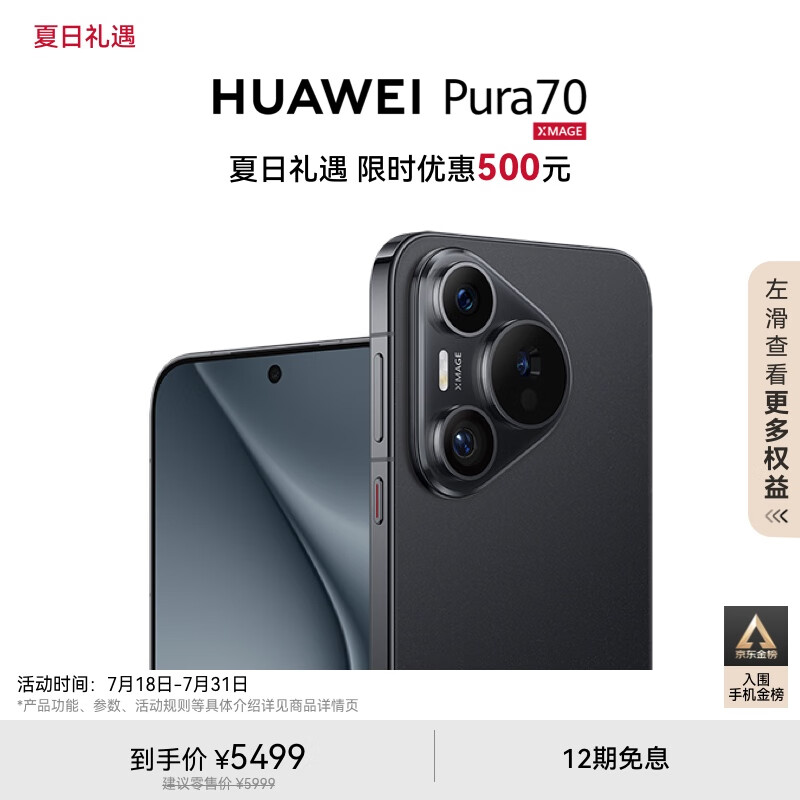 HUAWEI Pura 70 羽砂黑 12GB+512GB 超高速风驰闪拍 第二代昆仑玻璃 双超级快充 华为P70智能手机价格:5499.00元!