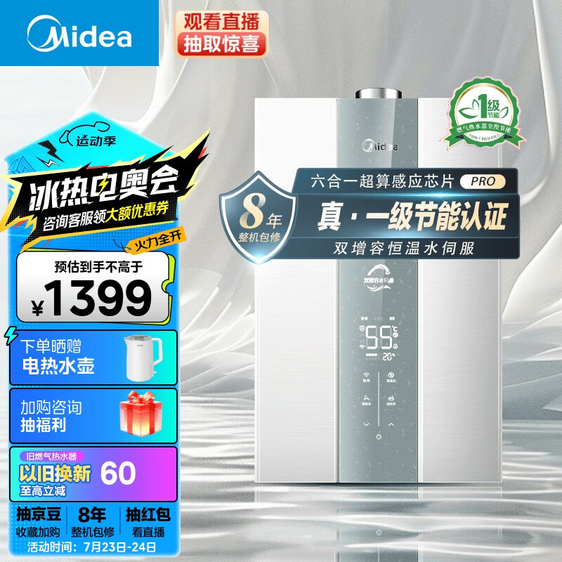 美的(Midea)16升燃气热水器 天然气 双增容水伺服恒温 一级节能 多重防冻 以旧换新 金刚速热舱 JSQ30-MK6 Pro价格:1399.00元!