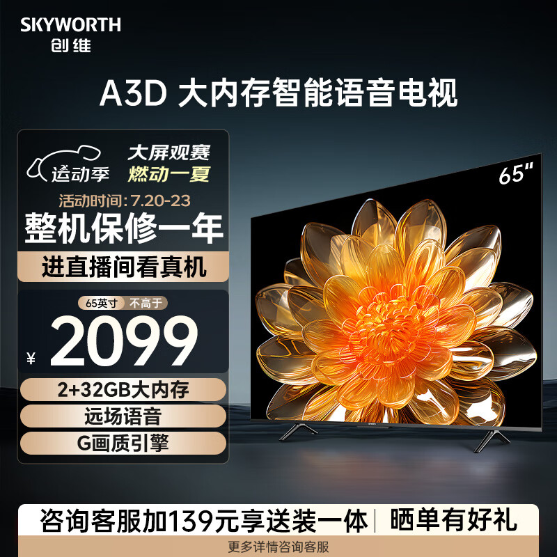 创维电视65A3D 65英寸电视机2+32G远场语音G画质引擎智能投屏4K超高清护眼屏价格:2099.00元!