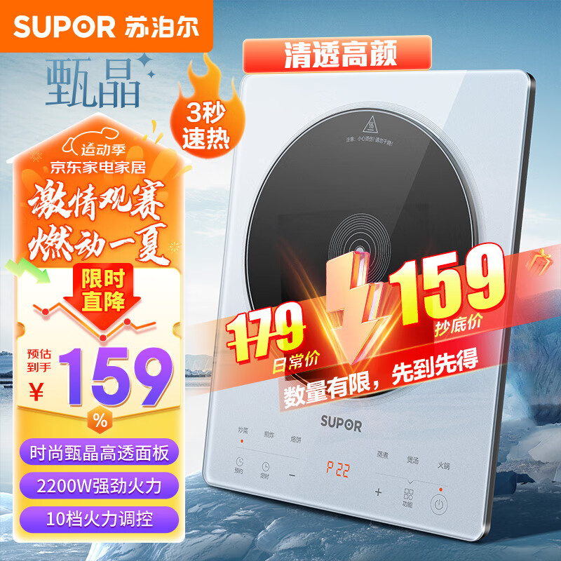 苏泊尔(SUPOR)甄晶透彩系列电磁炉家用2200W大功率爆炒电磁灶火锅炉电池炉三秒速热炒菜智能火锅计时C22-IA616D价格:159.00元!