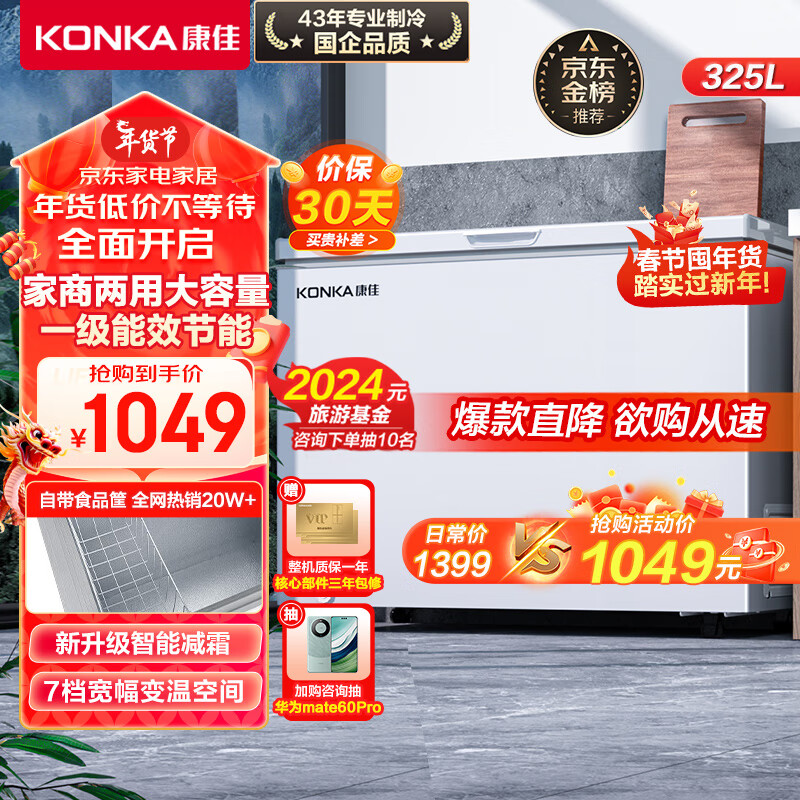 康佳325升一级能效家用商用大容量冰柜冷藏冷冻转换冷柜节能智能减霜单温母乳小冰箱BD/BC-325DTX价格:1109.00元!