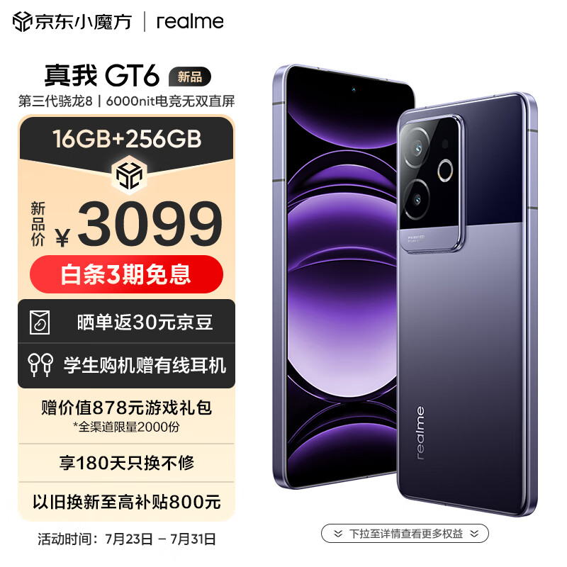 realme真我GT6第三代骁龙8旗舰芯 6000nit无双电竞直屏 5800mAh聚能电池 AI智能游戏手机 16+256风暴紫价格:3099.00元!