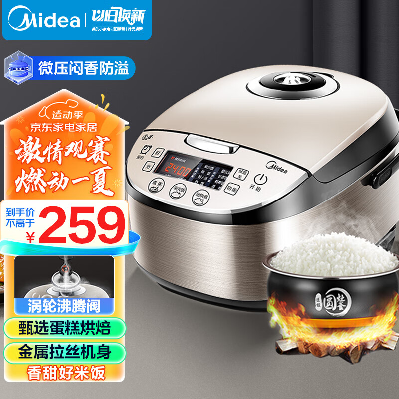 美的(Midea)智能电饭煲电饭锅家用4L预约气动涡轮防溢金属机身圆灶釜内胆多功能米饭锅WFS4037(3-8人)价格:259.00元!