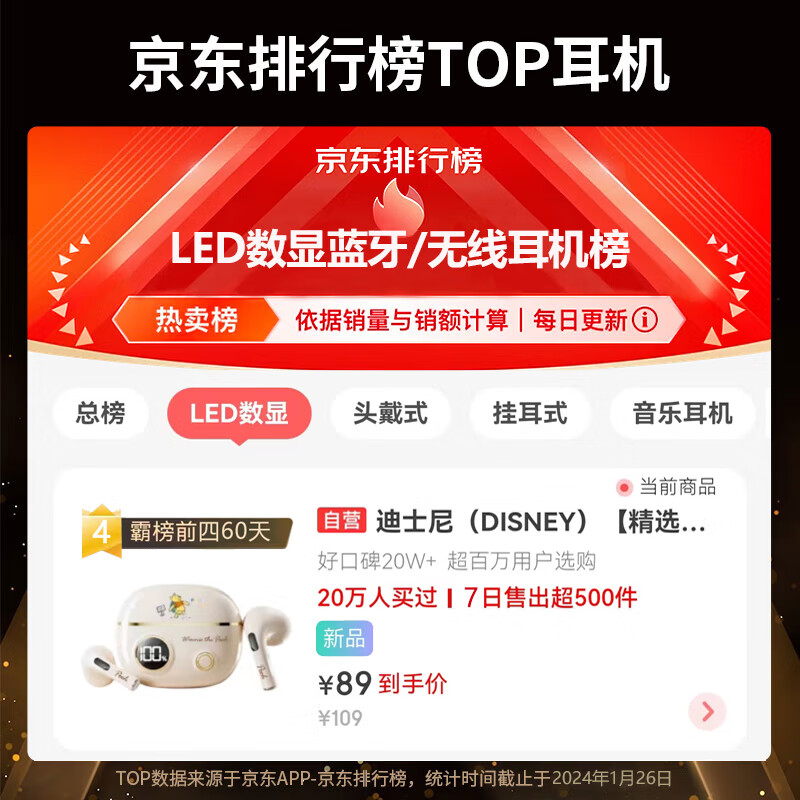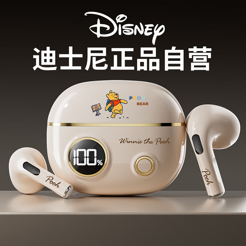 迪士尼(DISNEY)【柏林之声智能显屏】无线蓝牙耳机半入耳式游戏降噪跑步运动 通用苹果华为小米YP42【开心维尼】价格:109.00元!