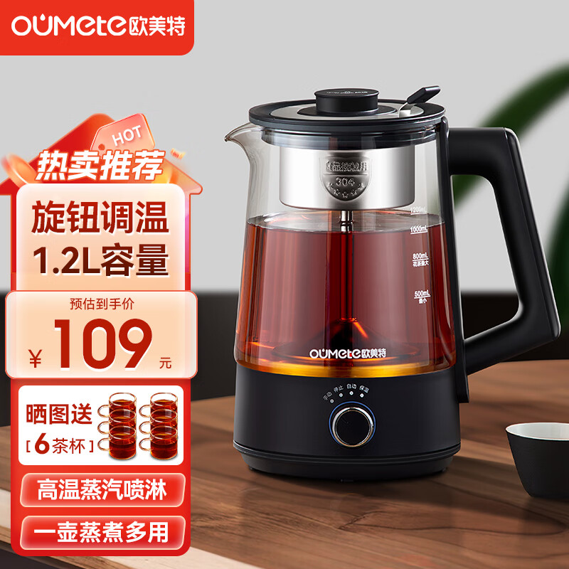 欧美特(OUMETE)煮茶壶 煮茶器 喷淋式蒸汽茶壶 养生壶 玻璃恒温保温煮茶烧水壶OMT-PC1016A价格:109.00元!