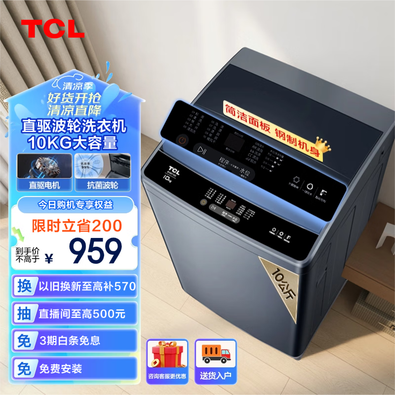 TCL 10KG直驱抗菌洗衣机T100 大容量 洗衣机全自动家用 以旧换新 宿舍租房神器 B100T100-D价格:1049.00元!