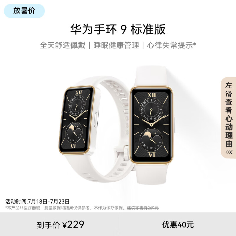 华为手环9 标准版 智能手环 羽沙白 轻薄舒适睡眠监测心律失常提示运动手环华为手表送男友送女友价格:239.00元!