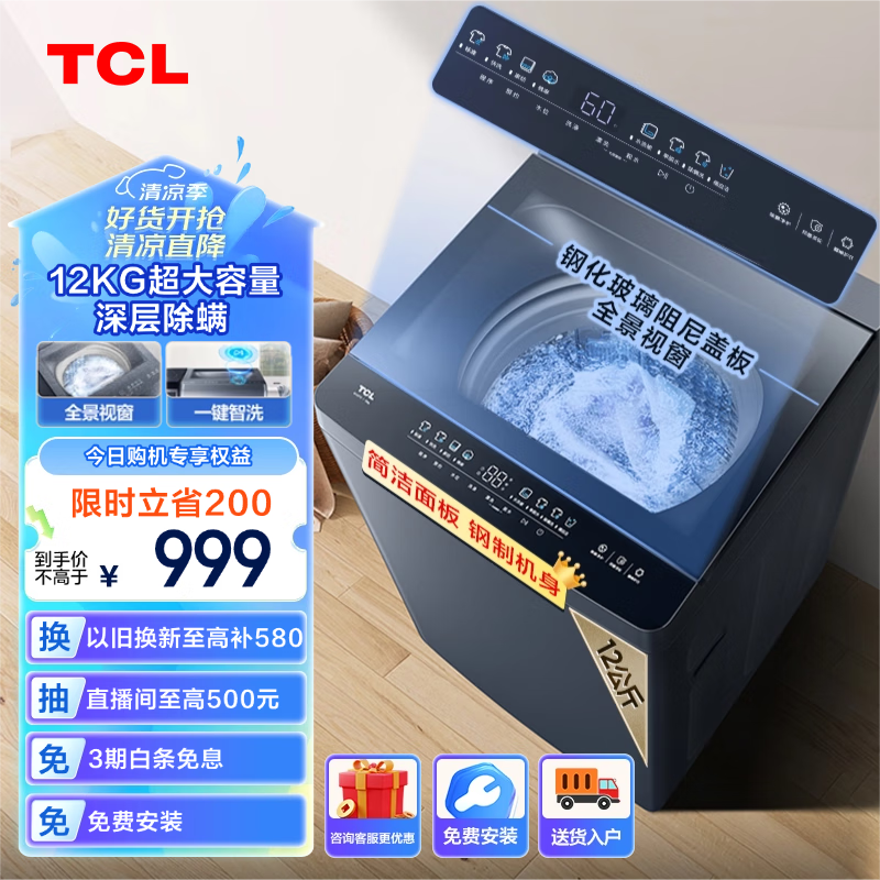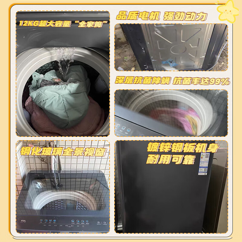 TCL 12KG超大容量全家桶T5 深层除螨 全景视窗 洗衣机全自动家用 以旧换新 宿舍租房神器 B120T5价格:1099.00元!