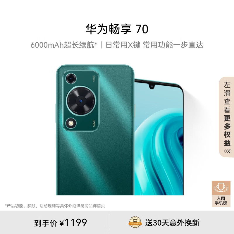 华为畅享 70 6000mAh大电池 长续航 畅享X键一键直达 128GB 翡冷翠 鸿蒙智能手机HUAWEI价格:1099.00元!