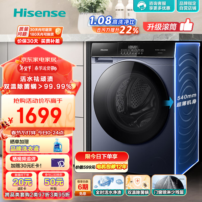 海信(Hisense)滚筒洗衣机全自动 10公斤大容量家用超薄 除菌净螨羊毛洗 活水洗科技 HG100DSE12F以旧换新价格:1699.00元!