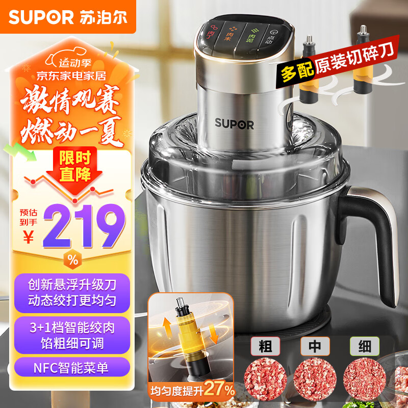 苏泊尔(SUPOR)绞肉机家用 电动多功能不锈钢悬浮刀料理搅拌机2.2L大容量馅婴儿辅食机 可调粗细搅肉机JR65S-G220价格:219.00元!