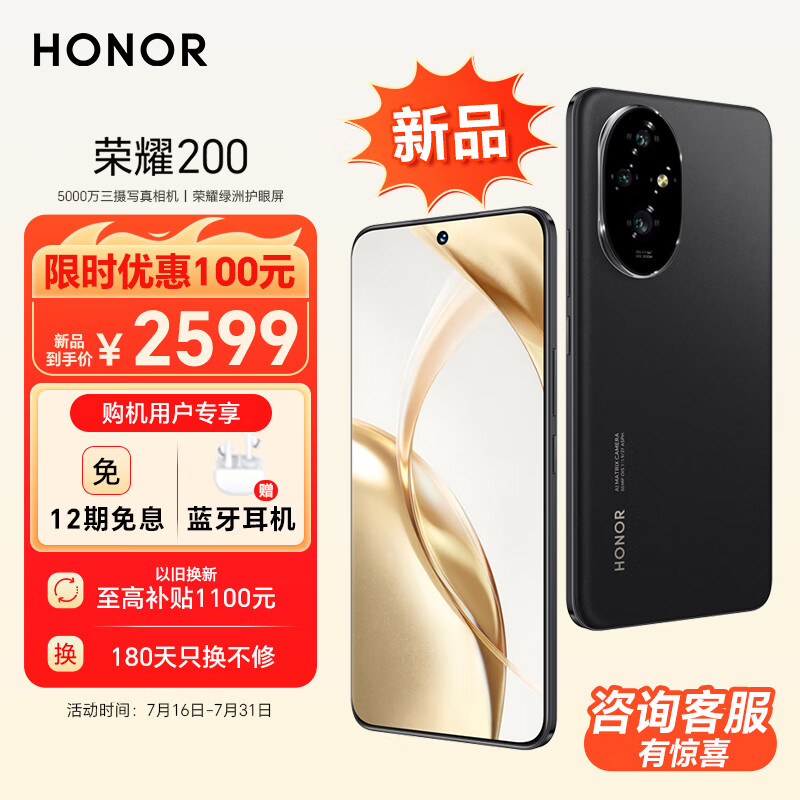 荣耀200 新品 旗舰级青海湖电池 绿洲护眼屏 5000万雅顾光影主摄 第三代骁龙7 AI 12+256 绒黑色 5G价格:2599.00元!
