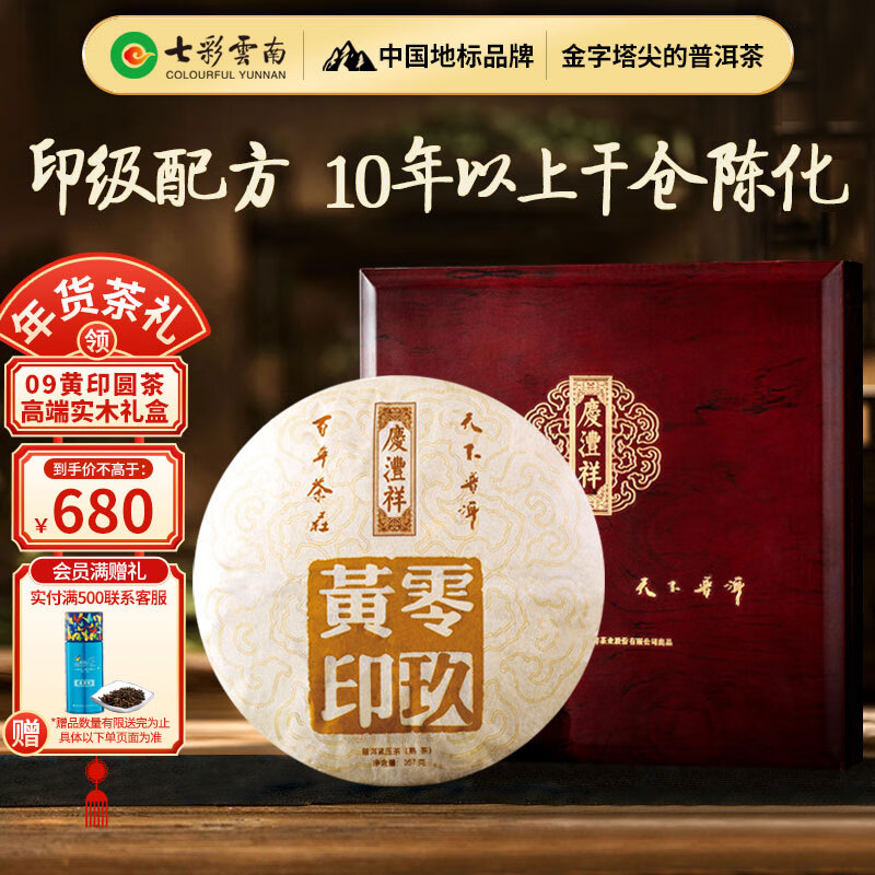 七彩雲南普洱茶 2009年印级普洱熟茶饼零玖黄印357g 年货礼品茶叶礼盒价格:909.00元!