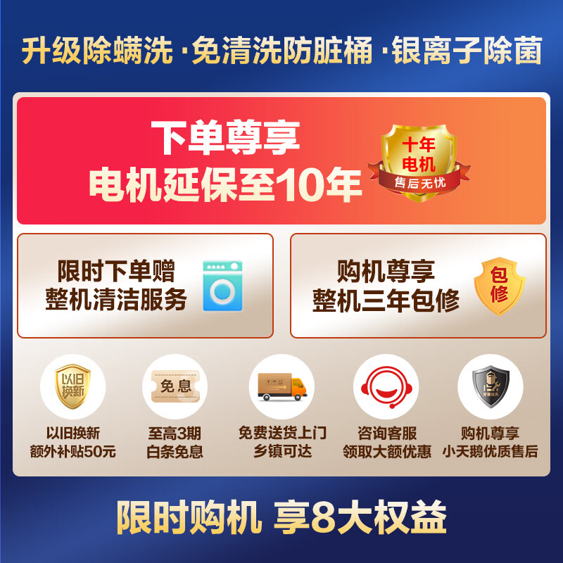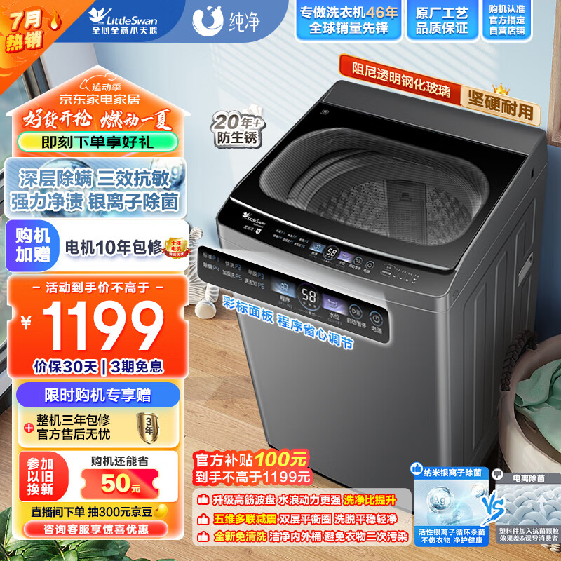 小天鹅(LittleSwan)波轮洗衣机全自动 纯净系列 10公斤大容量 免清洗不脏桶 银离子除菌 TB100V63AB价格:1199.00元!