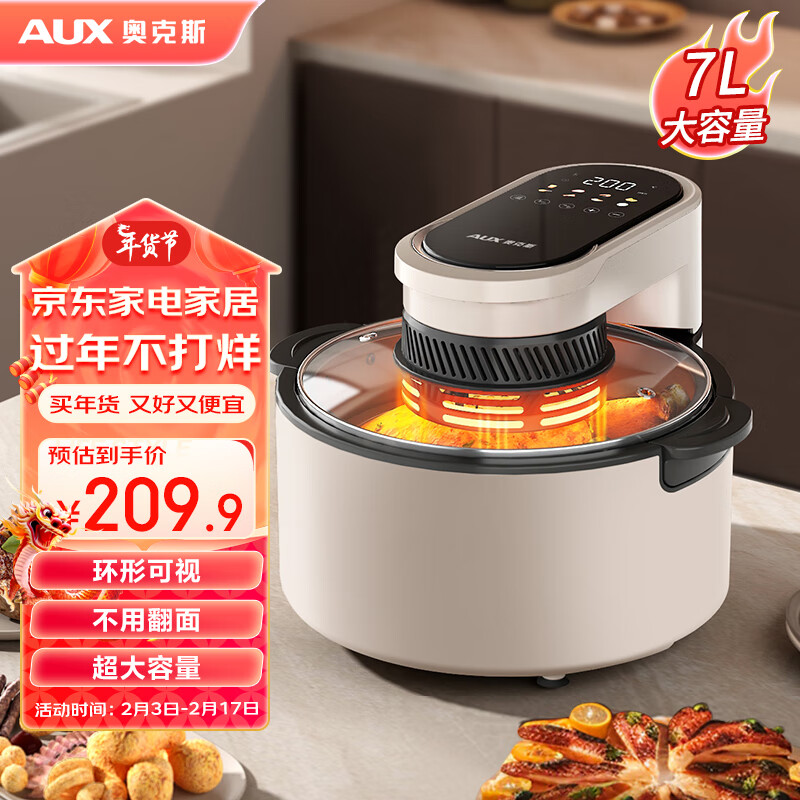 奥克斯(AUX)电子触屏空气炸锅 不用翻面 可视窗口 7.0L大容量 多功能易清洗 【象牙米】价格:209.90元!