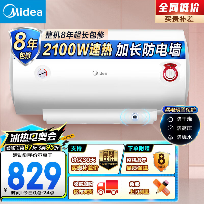 美的(Midea)【整机8年质保】80升电热水器2100W洗澡节能省电速热出租屋小型双重杀菌加长防电墙F80-21WA1价格:829.00元!