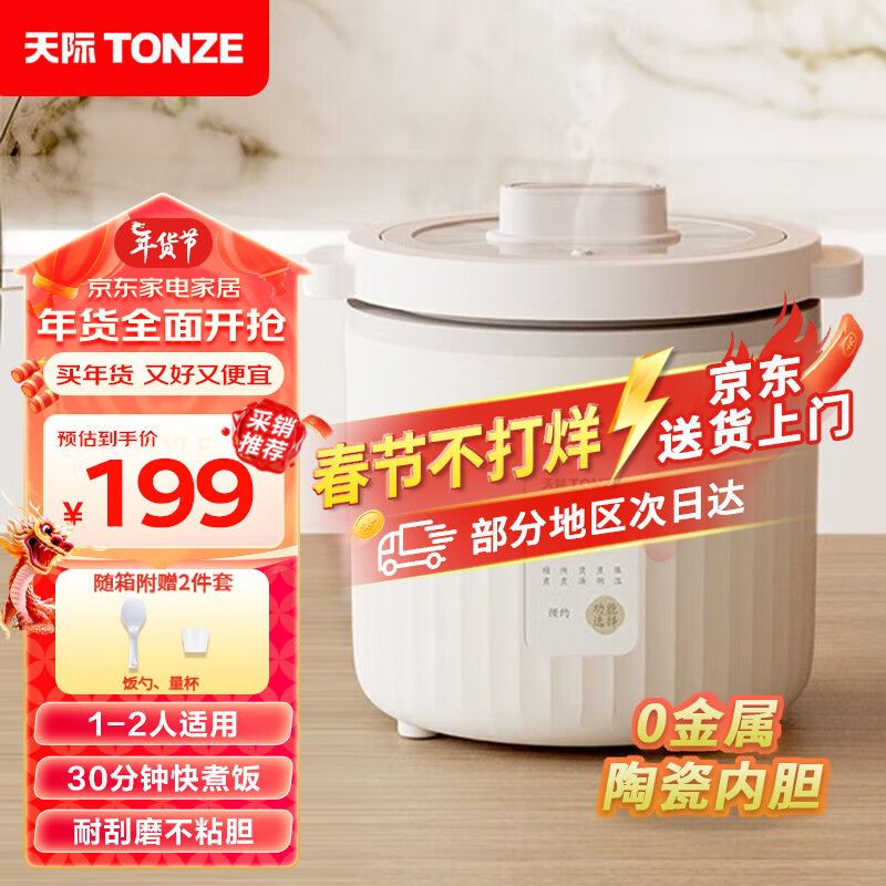天际(TONZE)陶瓷内胆电饭煲 1L迷你单人无涂层不粘电饭锅 1-2人家用智能仿柴火精煮粥煲汤蒸米饭锅 FD23B10TAW价格:229.00元!