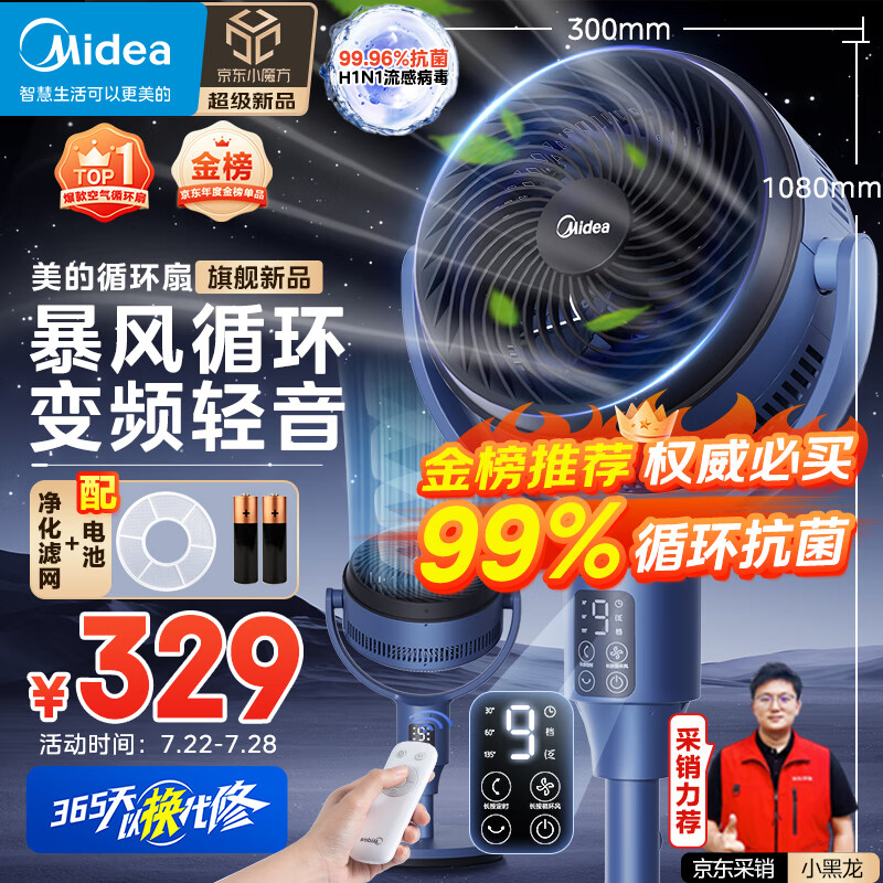 美的(Midea)【变频轻音】空气循环扇家用遥控电风扇四季净化扇轻音落地扇99%抑菌桌面小风扇大风力风扇GDG24ZR价格:499.00元!