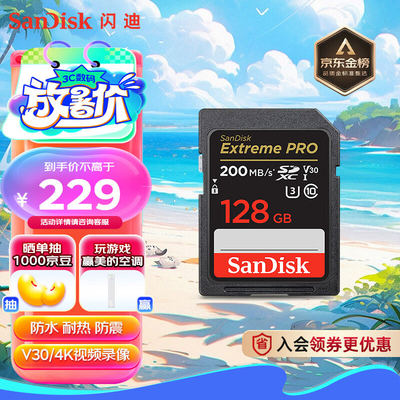 闪迪(SanDisk)128GB SD内存卡 4K V30 U3 C10 相机存储卡 读速200MB/s 写速90MB/s 微单/单反相机内存卡价格:229.00元!