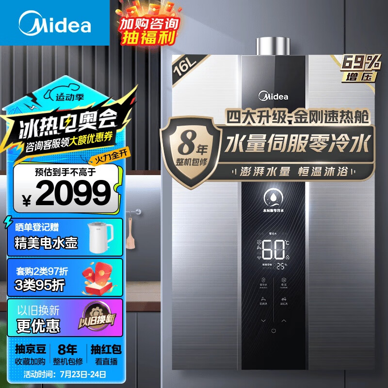美的(Midea)16升燃气热水器天然气 循环增压零冷水 智控水伺服 家用智能恒温 5重净水 家用节能 JSQ30-MK9耀界价格:2099.00元!