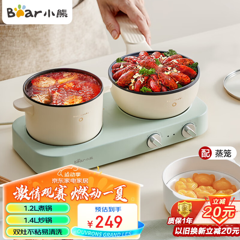 小熊(Bear)双灶电煮锅 电炒锅 多功能电火锅 分体式煎炒焖煮料理锅 宿舍用小煮锅 电热锅 DRG-E12J1配蒸笼价格:249.00元!
