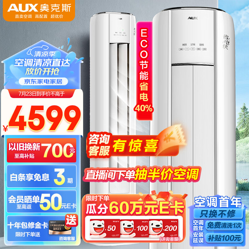 奥克斯3匹 省电侠 新1级能效 ECO节能 升级大风口 立柜式空调柜机KFR-72LW/BpR3GQS1(B1)强劲超远风价格:4599.00元!