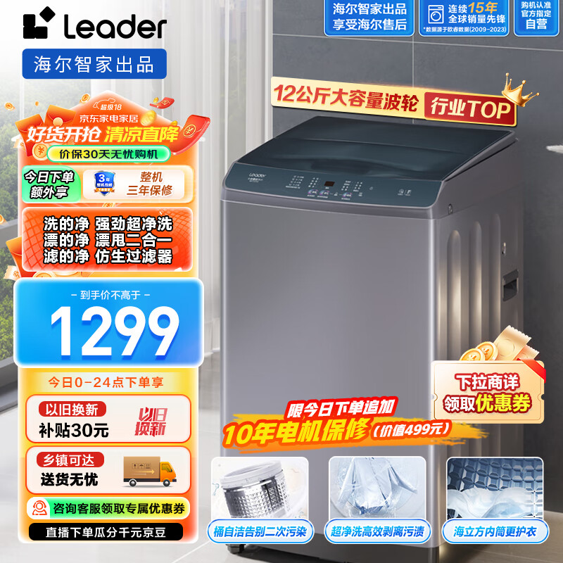 Leader海尔智家出品 波轮洗衣机全自动 12公斤大容量 超净洗去顽渍 洗衣参数可调 以旧换新 @B120Z369价格:1299.00元!