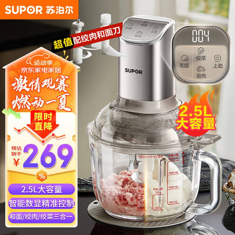 苏泊尔(SUPOR)绞肉机家用 和面机多功能揉面搅面绞馅机 打肉饺子肉馅碎肉机 搅肉机2.5L大容量JR68-B250价格:269.00元!