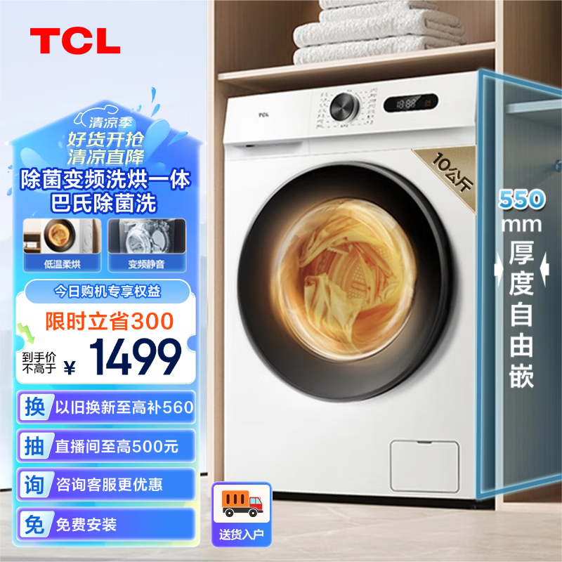 TCL 10KG变频滚筒L110除菌全自动滚筒洗烘一体超薄洗衣机除菌净螨 洗净比1.08 微蒸空气洗G100L110-HB价格:1599.00元!