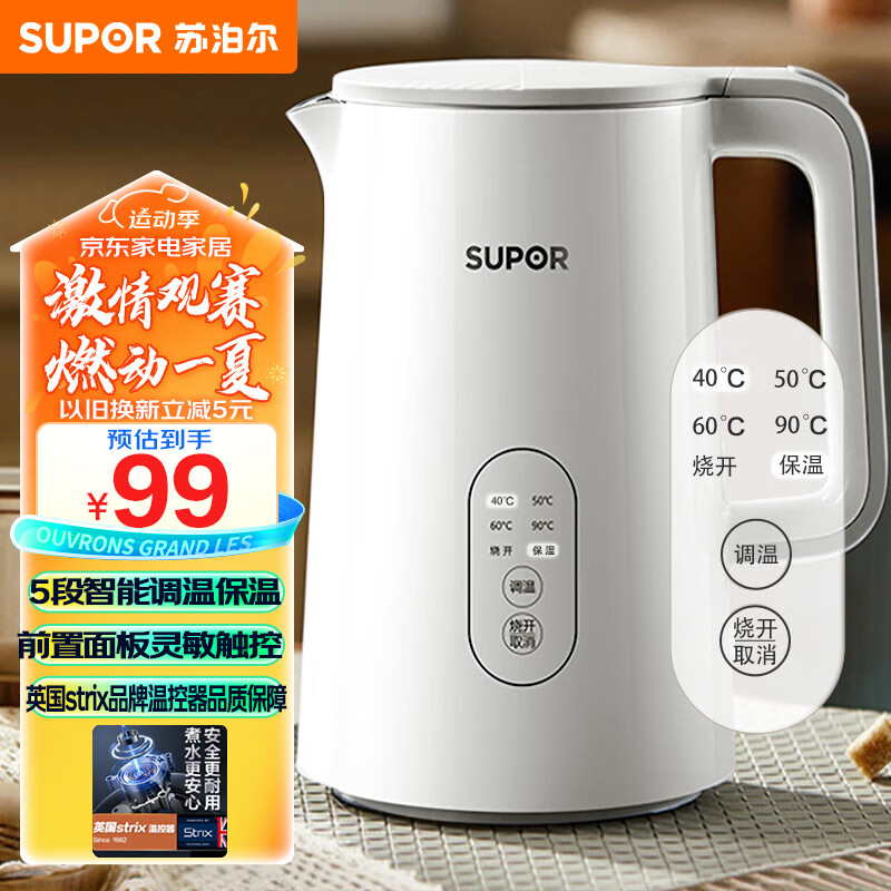 苏泊尔(SUPOR)1.5L侧显温度烧水壶 触控操作 5段调温保温恒温电热水壶电水壶 养生 SW-15J71A价格:99.00元!