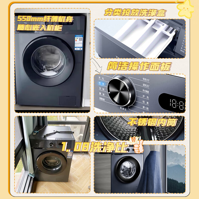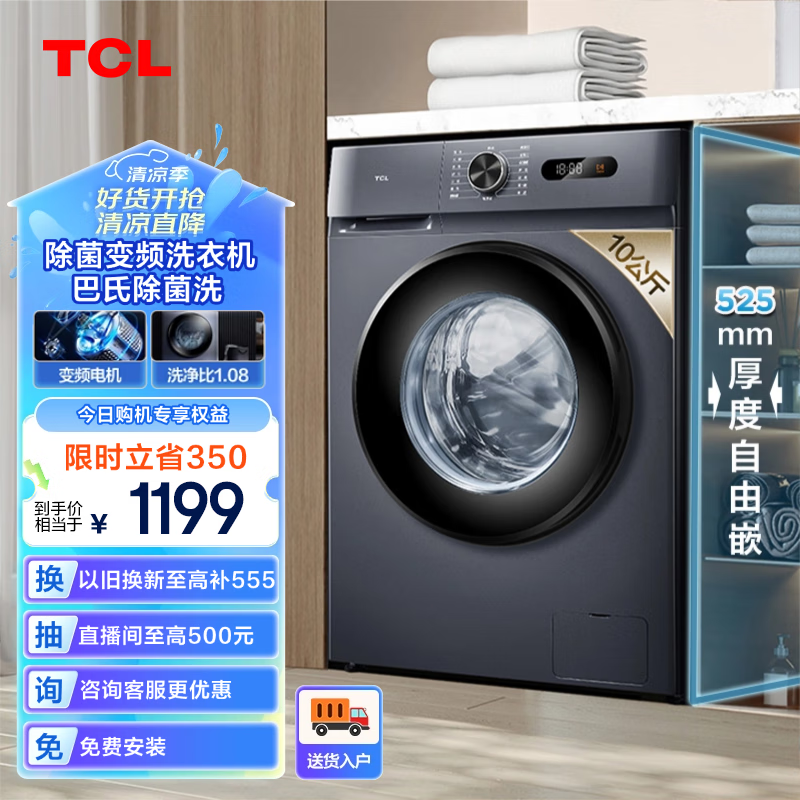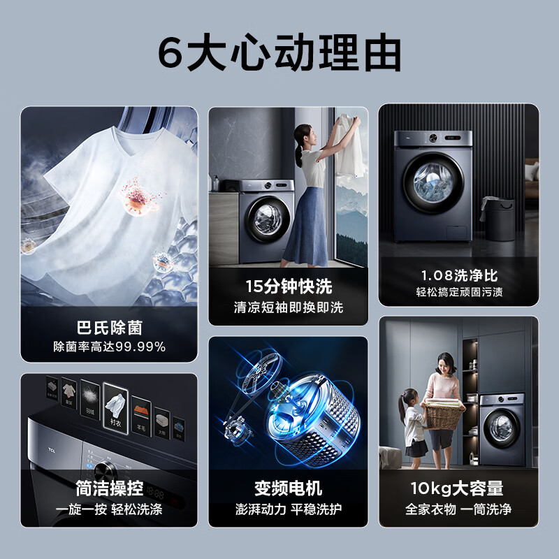 TCL 10KG除菌变频滚筒洗衣机 L130 巴氏除菌 高洗净比1.08 超薄嵌入 全自动洗衣机 G100L130-B价格:1249.00元!