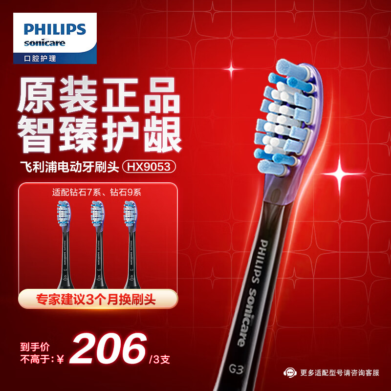 飞利浦(PHILIPS)电动牙刷刷头 智臻护龈型刷头G3 HX9053/96 3支装 黑色 适配钻石7系、9系价格:206.00元!