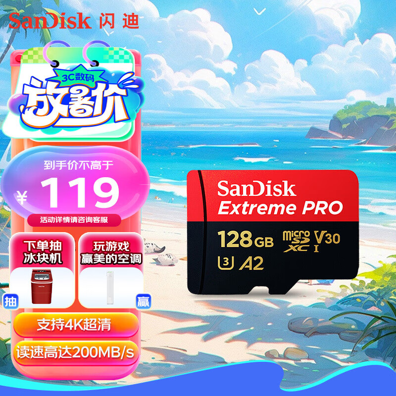 闪迪(SanDisk)128GB TF(MicroSD)内存卡A2 4K V30 U3 C10 超极速移动存储卡 读速200MB/s 写速90MB/s价格:119.00元!